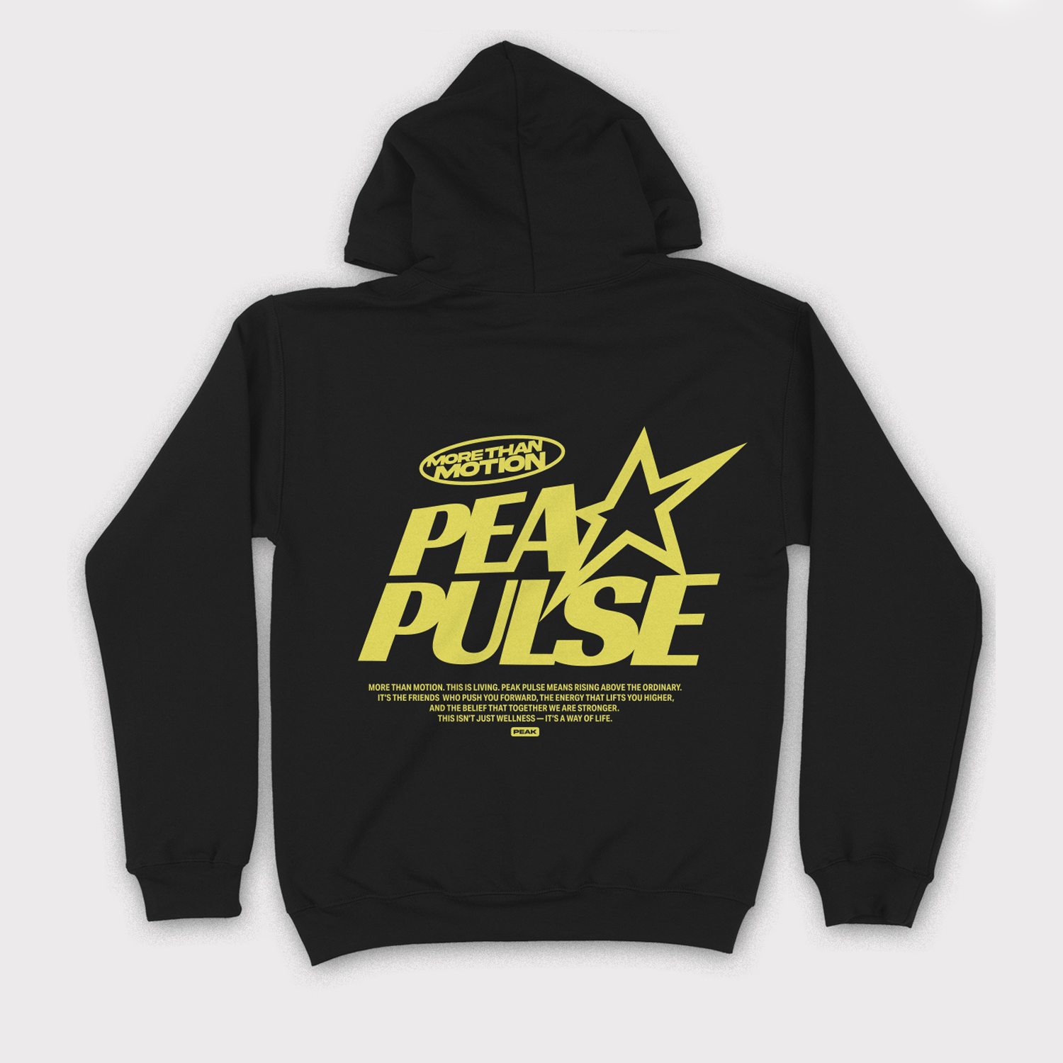 This 10 oz. Unisex Heavyweight Hoodie in Black features the yellow Peak Pulse logo on the front and “More Than Motion” and Peak Pulse design on the back — a reminder that movement is only the start.